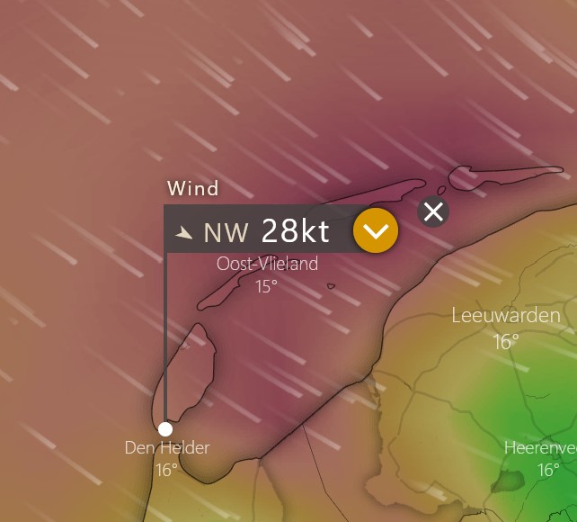 En vandaag blijven we in Den Helder. Het windkaartje hierboven zegt genoeg: op dit moment waait het stevig hier in Den Helder. Doet ons denken aan ons geplande oefenrondje Engeland toen het ook (te) hard waaide uit het westen. Lowestoft was niet bezeild en het werd IJmuiden en een ruig tochtje.