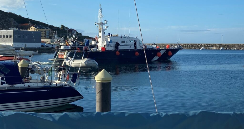 Ik ben even een boodschap gaan doen in de stad en bezoek hele kleine bouwmarktjes waar ik ongeveer vind wat ik nodig heb. En nog even langs die supermarkt om wat lunch voor vanmiddag te halen. Ik loop net het haventerrein weer op als ik een berichtje van Freddie ontvang. “Waar ben jij? De Spaanse douane is hier”. Even later loop ik de steiger op en zie ze twee man sterk net in gesprek met onze buurman, de Aldo, ook uit NL.