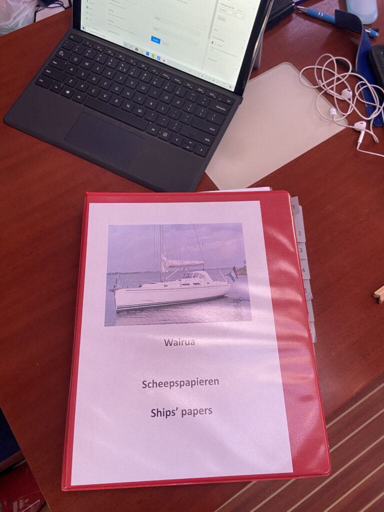 De officiële beambten gaan relaxt gekleed in t shirts, sportbroeken en Nike teenslippers. Als ze klaar zijn met Aldo draaien ze zich om naar ons en vragen om de bootpapieren. De map heeft Freddie al gepakt. Alles overzichtelijk bij elkaar, dat geeft een goede indruk, zeggen alle vertrekkerssites, dus wij scoren vast ook punten met onze indrukwekkende map met “Scheepspapieren” in twee talen erop.
