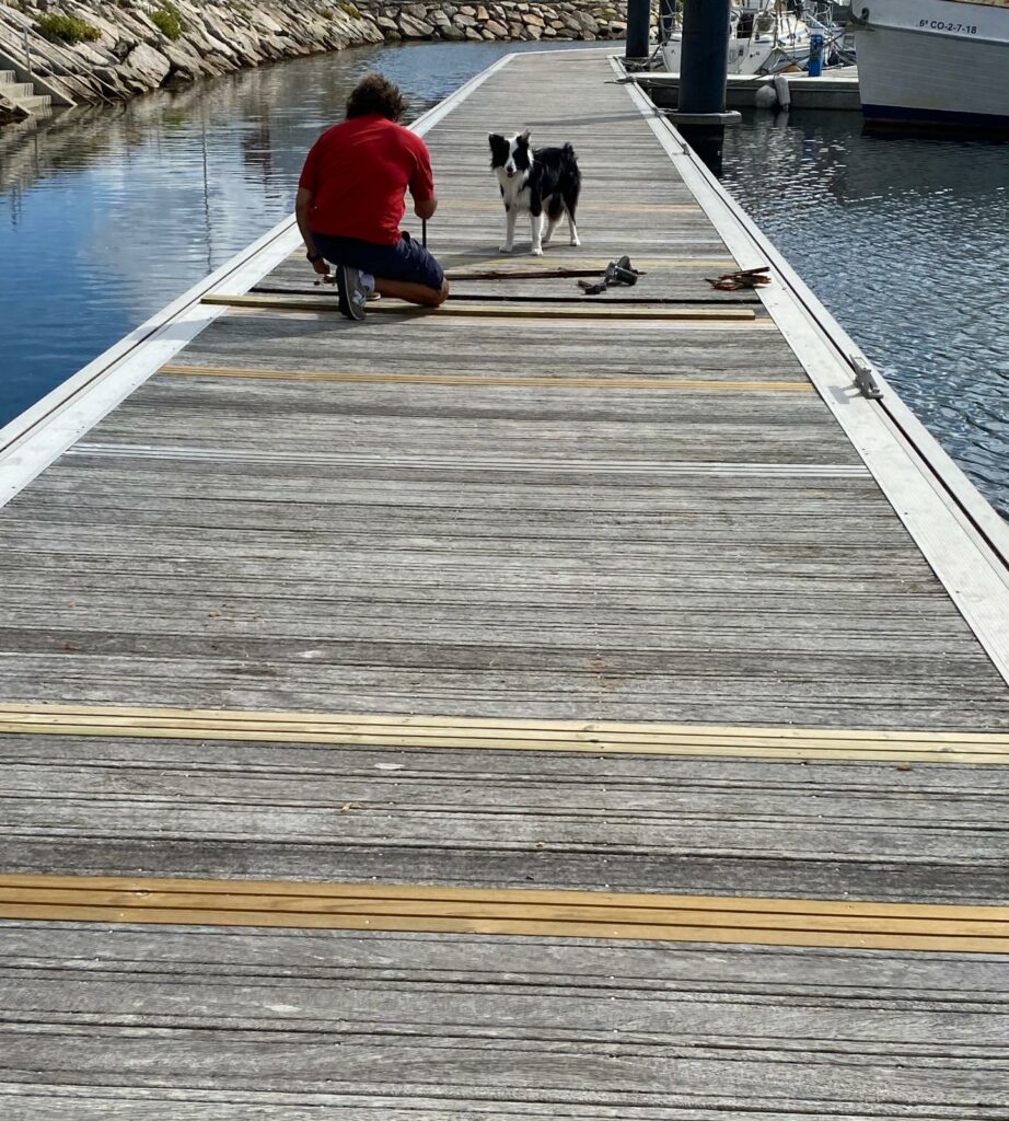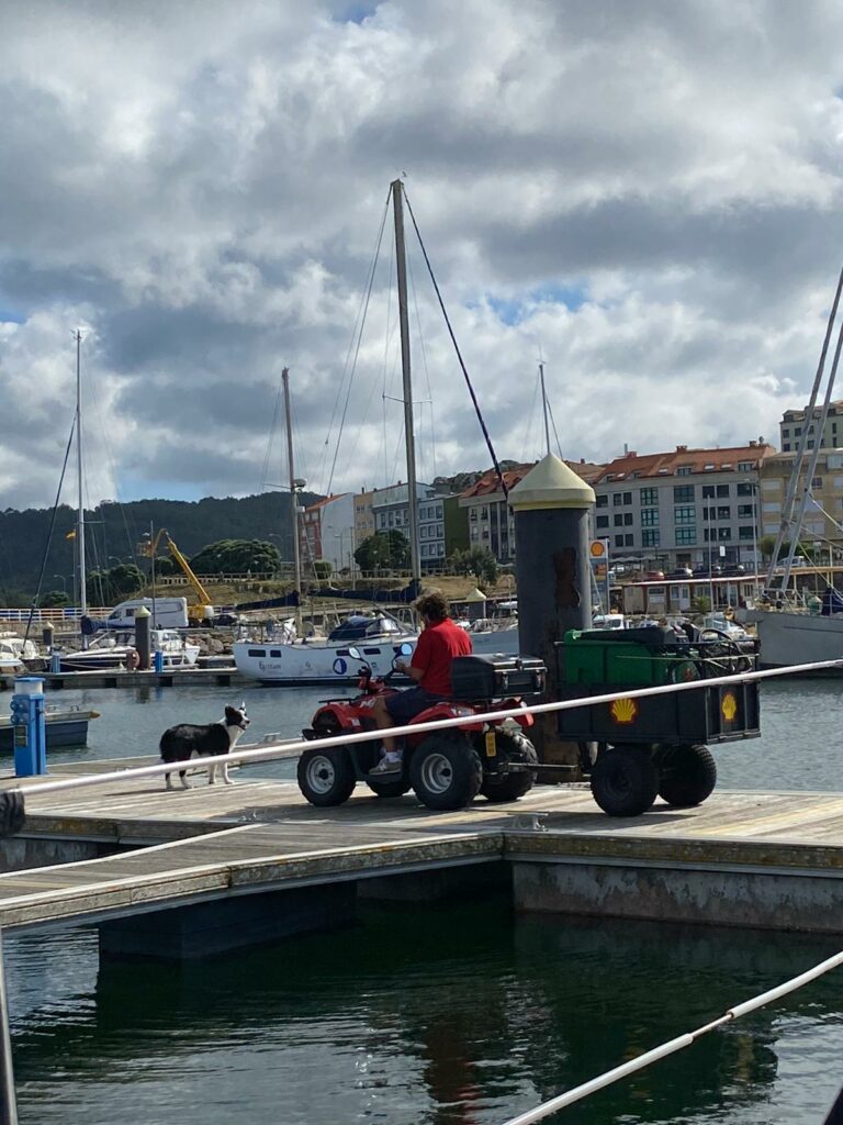 Een tweede kans voor een idyllisch Spaans havenstadje dan. Na een kort maar ruig tochtje (paaltjespikken met ruim 5 bft) komen we aan in de haven van Muxía, een verzameling stevige, goed onderhouden steigers. Deze worden op een rustig Spaans tempo plank voor plank vervangen door de vrolijke havenmeester (en hond). Omdat er geen tankstation is komt deze zelfde havenmeester (en hond) persoonlijk de diesel brengen op een quad met mini aanhangwagen. Het wc en douche gebouw is een houten hut los van het havenkantoor en bestaat uit 3 badkamers, compleet met douche, wc, kraan, een raampje en een vrolijk behangetje.