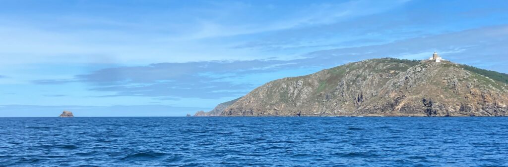 Er worden een aantal dagen met heel weinig of lichte zuidelijke winden voorspeld. Het geknutsel aan de steigers in Muxia hebben we wel gezien en dat geldt blijkbaar ook voor alle Nederlanders en Denen aan onze steiger. Allemaal zijn ze bezig om te vertrekken. Er is ZO-wind voorspeld, maar het lijkt meer op NO vanuit de haven. Om half 10 gooien we los en buiten de haven hijsen we de zeilen. Hmmm, veel wind is het niet en eenmaal buiten blijkt het toch wel ZO te zijn, de richting waar we na een uurtje ongeveer naartoe moeten. De motor gaat bij en op het moment dat we recht tegen de paar knopen wind invaren halen we de klapperende zeilen er maar weer af. We zetten een kopje koffie en genieten van de mooie Spaanse kust.