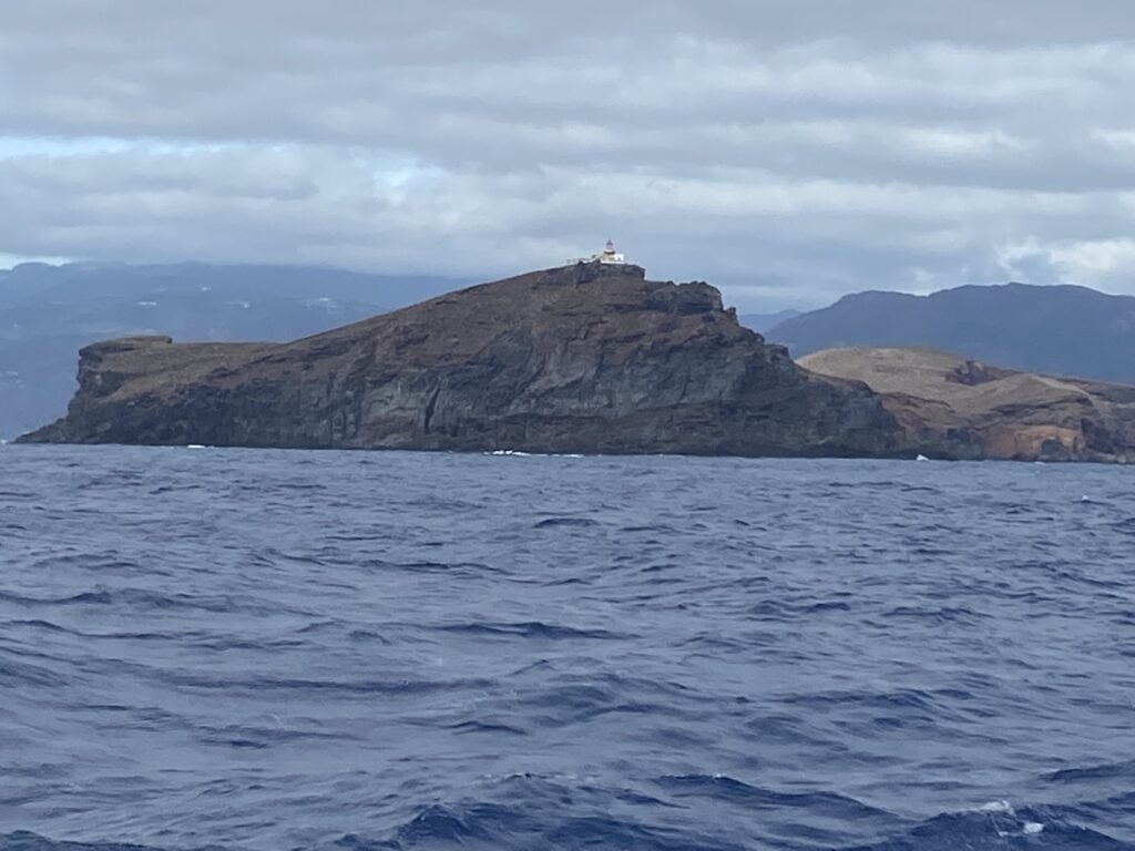 Slapen zit er niet in, we zijn eigenlijk allebei niet moe. Dus we zitten een tijdje binnen met e-readers, totdat uiteraard de wind weer begint te draaien. We moesten de koers toch aanpassen dus gaan we maar weer naar buiten. Preventer, stormrondje, you get the picture. Inmiddels een geoliede machine. En in de verte: land! Het eerste eiland van de eilandengroep Madeira, Ilha do Porto Santo. Donkere silhouetten van bergen tegen een grijze lucht, de stad schijnt een vaal geel licht op het wolkendek erboven.