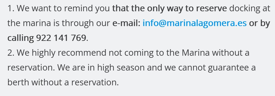 De spelregels voor Marina La Gomera zijn volstrekt duidelijk. Even een mail sturen of bellen om een plekje te reserveren en dan is er niets aan de hand. Gewoon aanbellen wordt afgeraden…