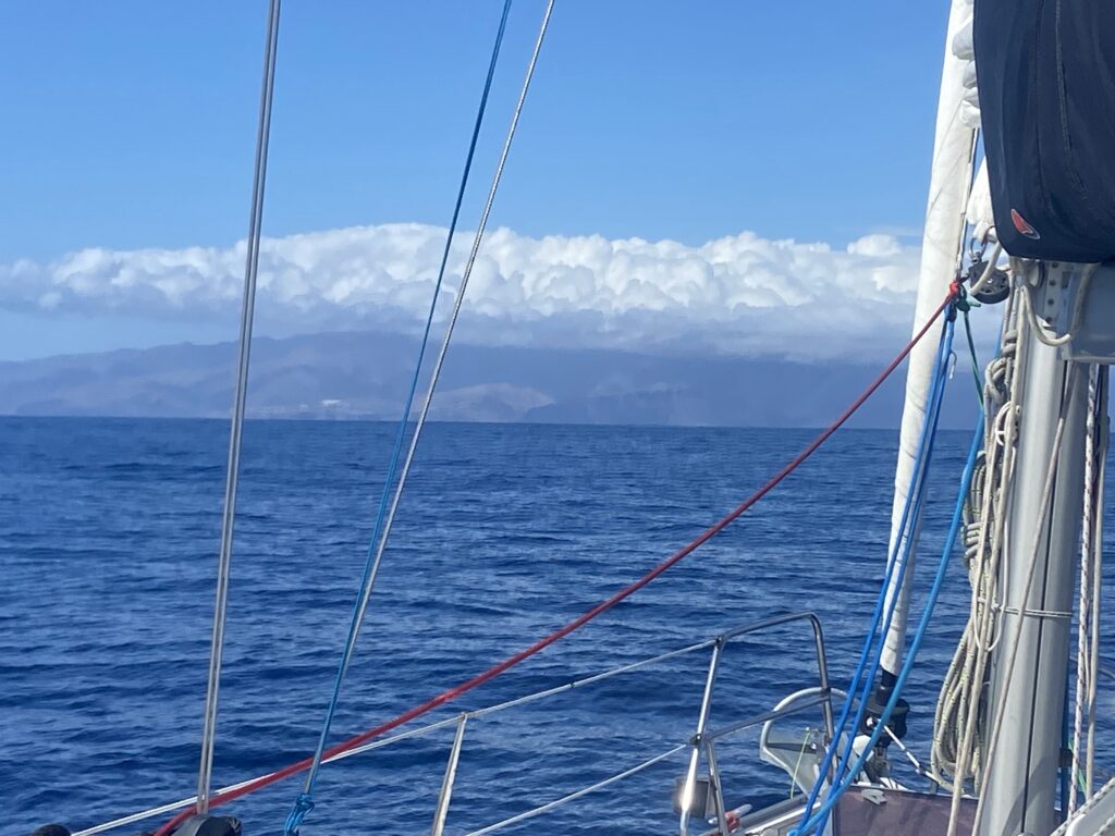 Wij vervolgen onze tocht net zo relaxed, tot opeens de wind begint toe te nemen, en verder toe te nemen. We komen in de acceleratiezone, een gebied tussen de eilanden waar de wind door een tunneleffect opeens heel veel kan toenemen, soms wel met 3 bft. Zo ook nu: van rustig dobberen met een knoop of 8 wind staan er opeens uitschieters tot 28 knopen wind op de teller. Maar uit de goede hoek, dus met deels ingerolde fok gaan we snel naar La Gomera. De wind blijft staan tot aan de haven, maar binnen komen we een beetje in de beschutting en is het goed te doen. Over de haven schrijven we laten…