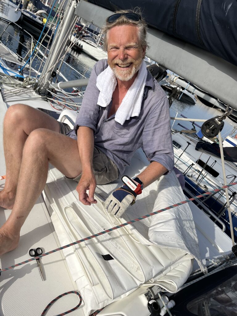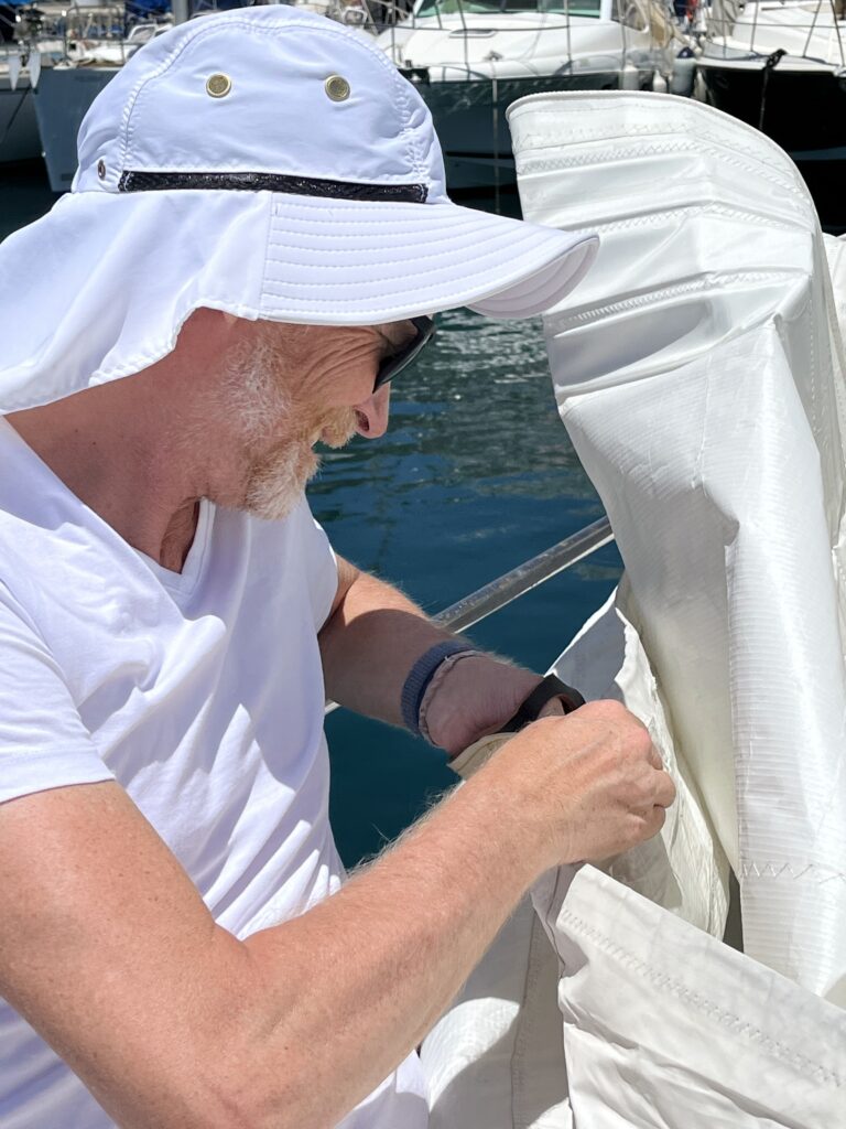 De vrouwen en dochters thuis zoeken elkaar met enige regelmaat op en vinden troost voor onze afwezigheid in het gezamenlijk bedrijven van verschillende handwerkhobby’s. Fred wil niet achter blijven en heeft in zijn gedegen inspectie een aantal plekken op de fok (voorzeil) en een op de huik (zak waar het zeil verblijft als er niet gezeild wordt) gevonden die gerepareerd moeten worden.