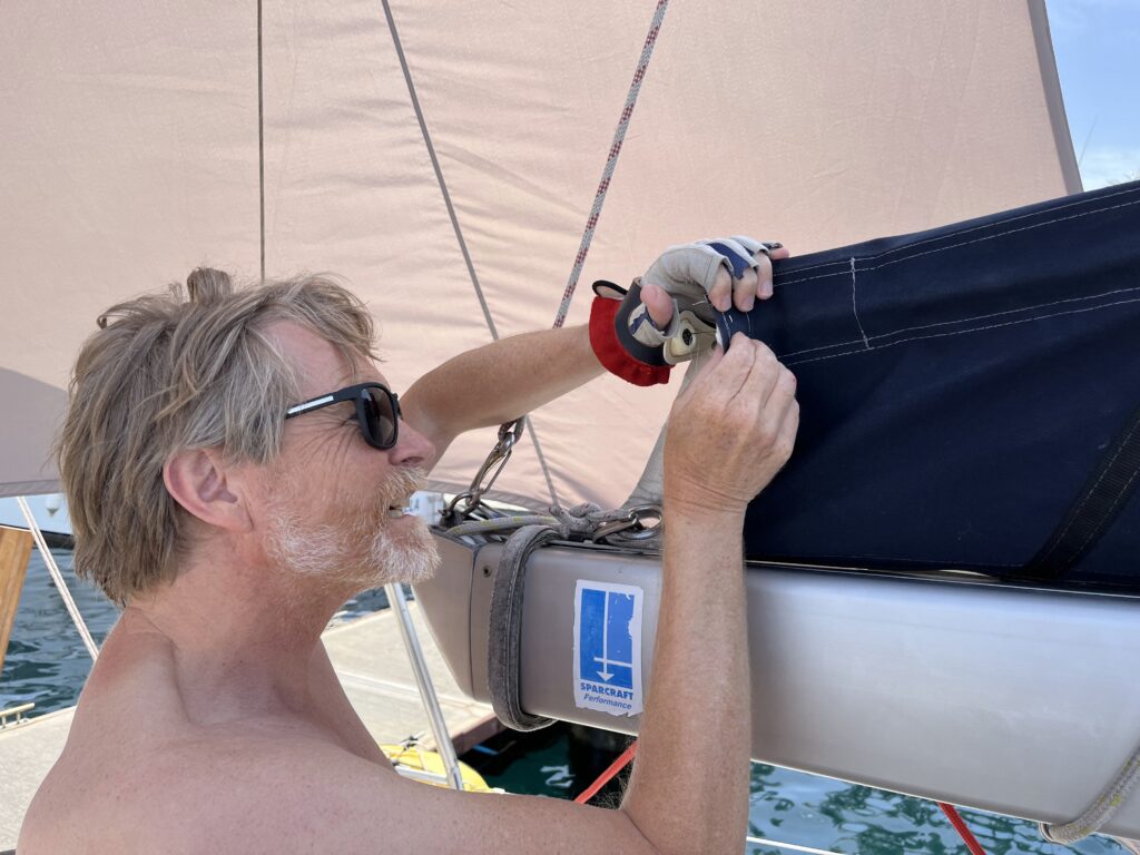 Met naald en draad en een speciale tool om de naald door de weerbarstige stof te duwen worden achtereenvolgens een scheurtje in het onderlijk van de fok, de achterkant van de huik en een versteviging van het voorlijk gerepareerd …..mooi werk!
