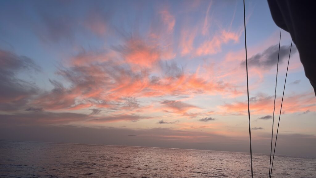 Ook de volgende dag waait het lekker door. Helaas draait de wind langzaam naar het noorden en buigen wij mee naar het westen. We wijken af van onze koers naar Santa Maria en het thuisfront blijkt zich af te vragen waar we eigenlijk naartoe gaan. Dat wordt rond middernacht van de laatste nacht duidelijk als de wind en de koers goed zijn om overstag te gaan en we weer op Santa Maria kunnen koersen.