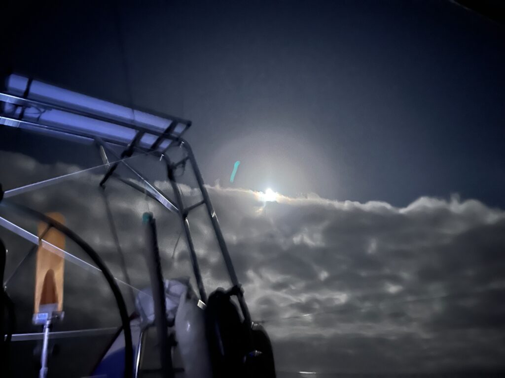 De vierde (of vijfde) nacht heeft een heel ander karakter, Er was dus die depressie boven de Azoren, Volgens de windmodellen zouden we door een staartje daarvan varen, met wind tot maximaal zo’n 25 knopen. Dat pakte een beetje heftiger uit. Midden in de nacht blijkt het daar niet te stoppen en trekt de wind tot zo’n 30 knopen aan, met uitschieters tot 35. Denk ik, want de “feel good” mode van de windmeter laat dit voor onze gemoedsrust niet zien en staat op “—” (als de wind minder wordt doet tie het weer). Het wordt een enerverende nacht met weinig slaap.