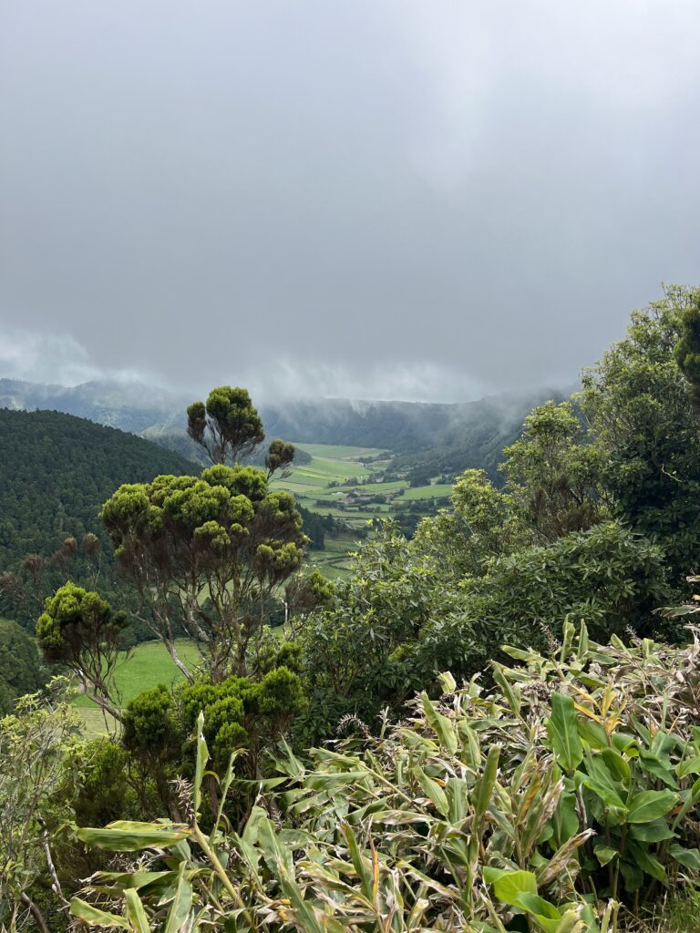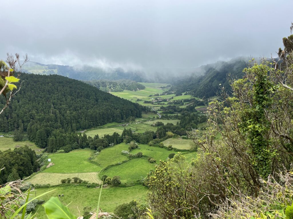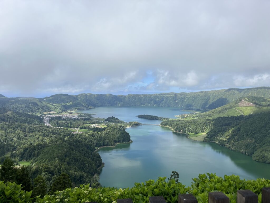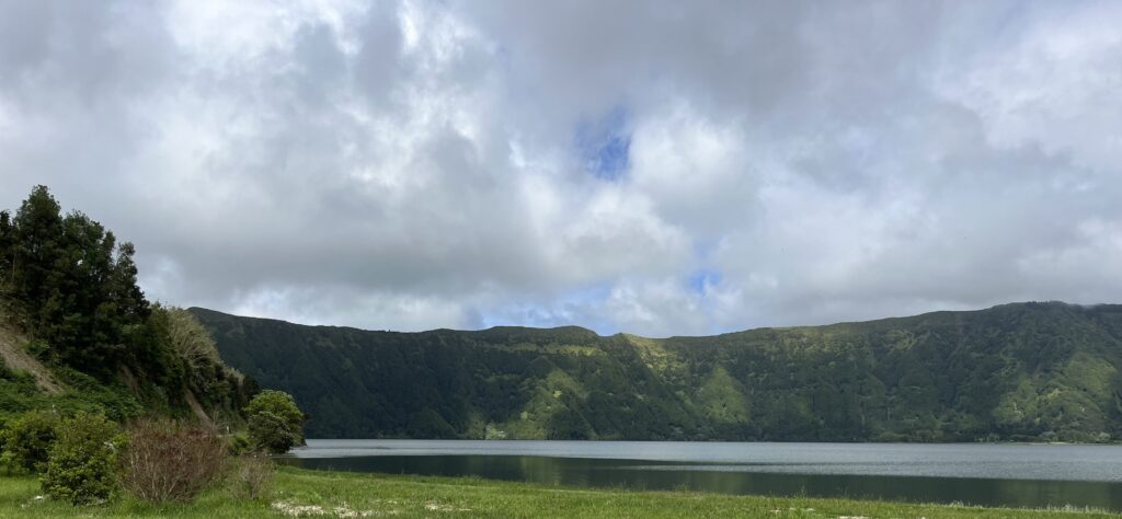 Rond 12 uur vertrekken we op weg naar een oude caldera (36.000 jaar oud bleek deze te zijn) met daarin twee grote kratermeren. De Lago Verde en Lago Azul. De route er naartoe is al prachtig. Het eiland is fris groen, met gras, struiken, bomen en ongeveer langs de hele route, waar we ook rijden, staan bloeiende hortensia’s langs de weg. Het ruikt heerlijk.