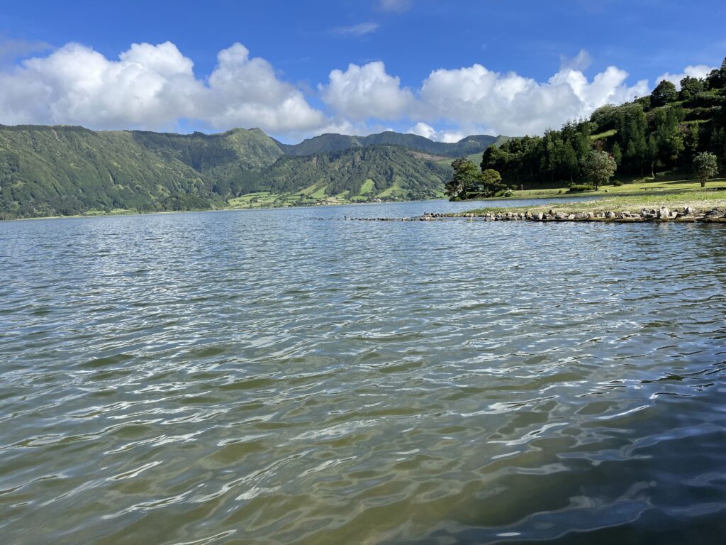 Tijdens de route naar boven stoppen we al een paar keer voor prachtige doorkijkjes naar de groene valleien. Bovenaan heb je een schitterend uitzicht op de twee meren. Vervolgens zijn we weer naar beneden gereden, naar een dorpje dat in de caldera aan de rand van het grote meer ligt. Dat blijkt een heel bijzondere plek. Het is er erg stil waardoor je overal vogels hoort. Er is geen wind en heerlijk warm. Staat wel in de top 5 bijzondere plekken van deze reis.